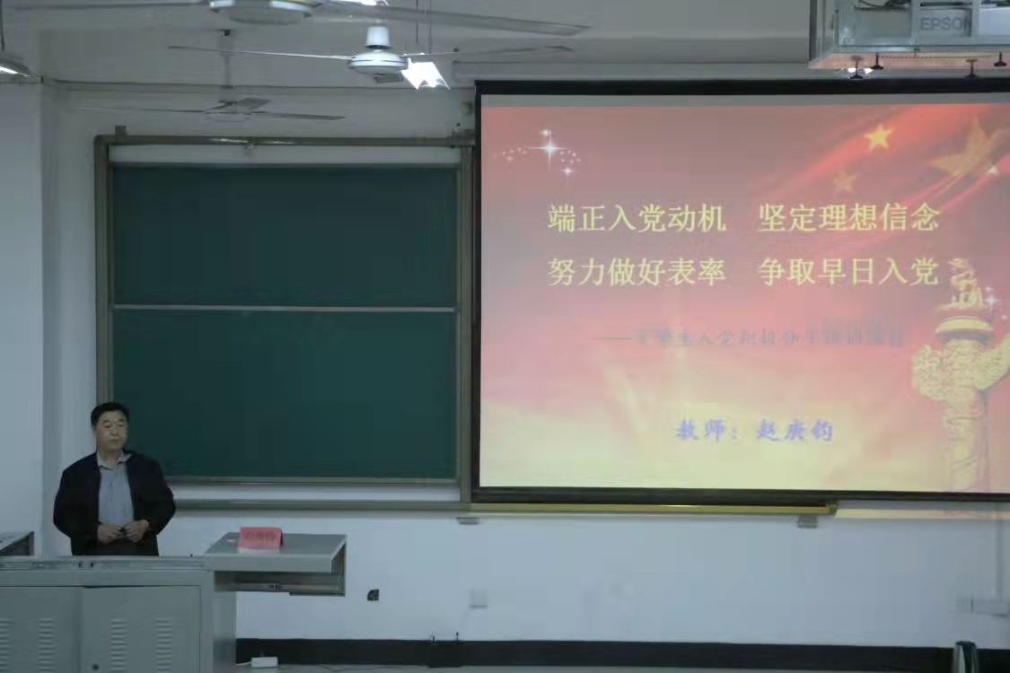 4月13日晚上,我校教师赵庚钧于A3–114教室为我院入党积极分子和预备党员上党课。