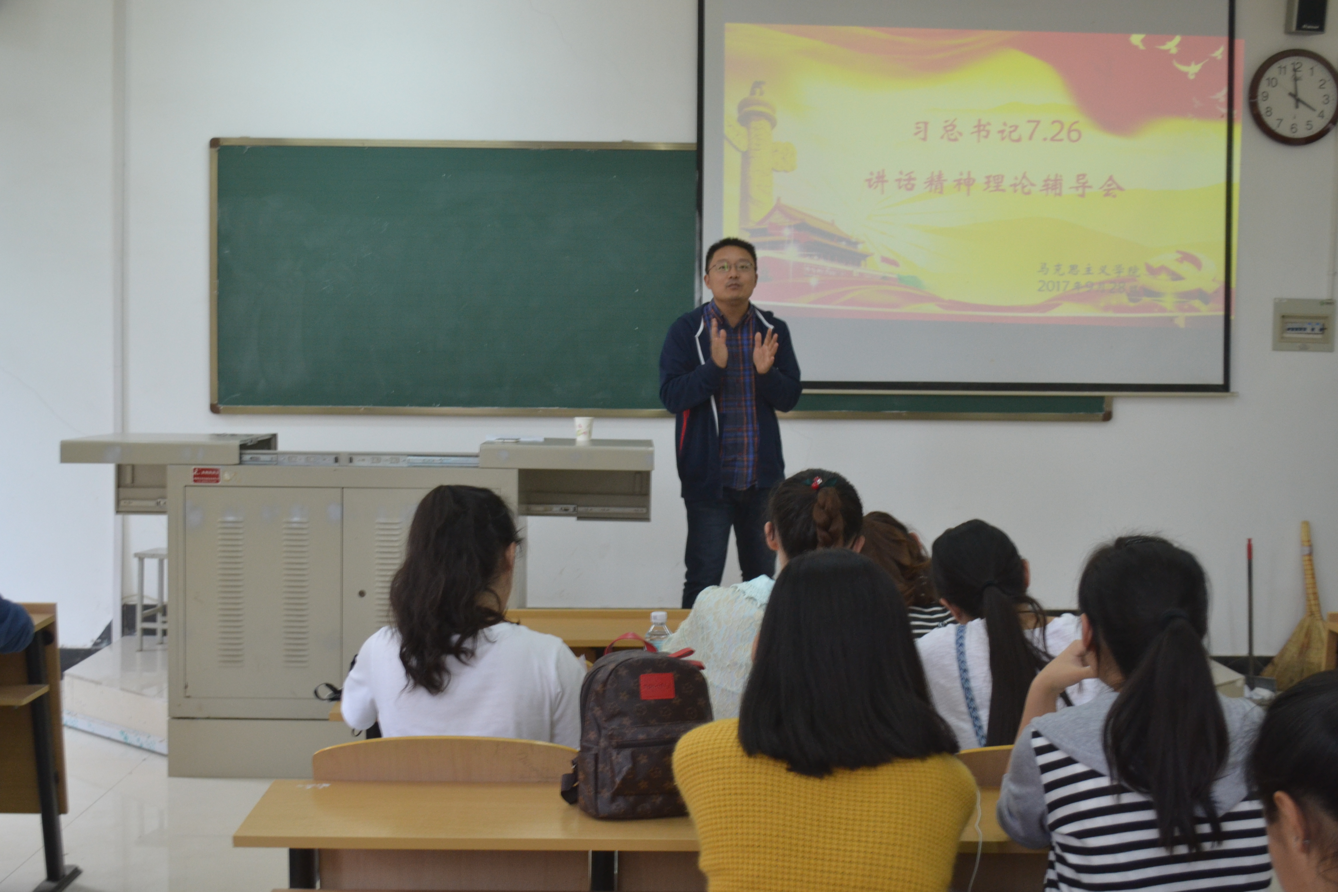 王敏光老师则就“习近平总书记726讲话精神”于104教室为我院思政党支部及第五期永信班部分学员召开专题学习会。首先,王老师将“道路自信、理论自信、制度自信、文化自信”与“经济建设、政治建设、文化建设、社会建设、生态文明建设”相结合,强调发展经济一定要与保护生态相结合,真正做到“既要金山银山也要绿水青山”。接着,王老师又结合“四个全面”与同学们一同回顾了党的发展史以及全面从严治党以来的多项成就。建设中国特色社会主义是党和国家必须不断推进伟大事业,也是实现中华民族伟大复兴中国梦的必由之路。