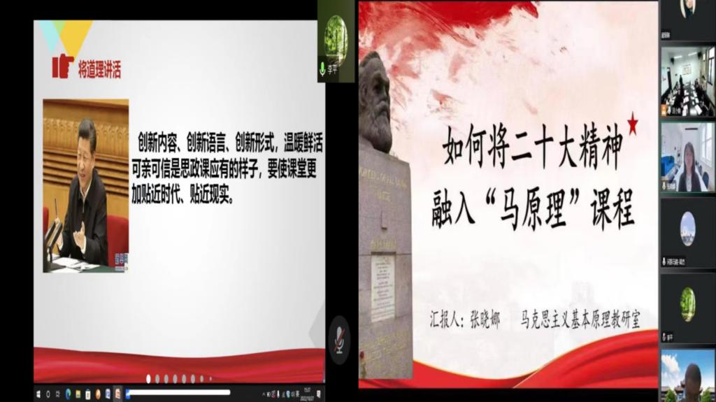 为推动党的二十大精神进校园、进课堂、进头脑,10月27日下午,我院举行“党的二十大精神融入思政课”集体备课会。会议邀请河南大学马克思主义学院执行院长任东景教授,河南省高校思政课名师工作室名师、河南职业学院马克思主义学院院长梁杰教授在线指导。校党委副书记宋文献,党委宣传部、教务处负责人,以及我院全体教师通过线上线下相结合的方式参加了集体备课会。