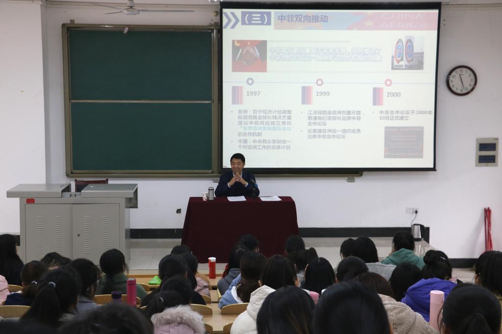 课堂伊始,王洪彬书记通过追溯中非建交遥远历史,说明了中非建交历史久远。尤其是自新中国成立以来,在西方资本主义国家的压力下,中非关系继续向前发展,并构建了牢不可破的友谊。接着,王洪彬书记依次从中非发展、国际形势,中非双向推动三个方面详细介绍中非国际论坛的创建背景,他指出中非合作论坛的创建是立足于整体,着眼于未来的。接着,他又简要地向同学们介绍了中非合作论坛组织架构和发展历程,体现该论坛是中非双方“平等磋商,增进了解,扩大共识,加强友谊,促进合作”的平台。紧接着,王洪彬书记从政治、经贸、发展、安全四个领域列举中非合作的丰富成果,并强调中国对非洲的援助绝非是“新殖民主义”,而是政治支持、经济支援、真诚合作。最后,王洪彬书记表示中非关系是患难之交,定会在中非合作的大框架下继续发展。
