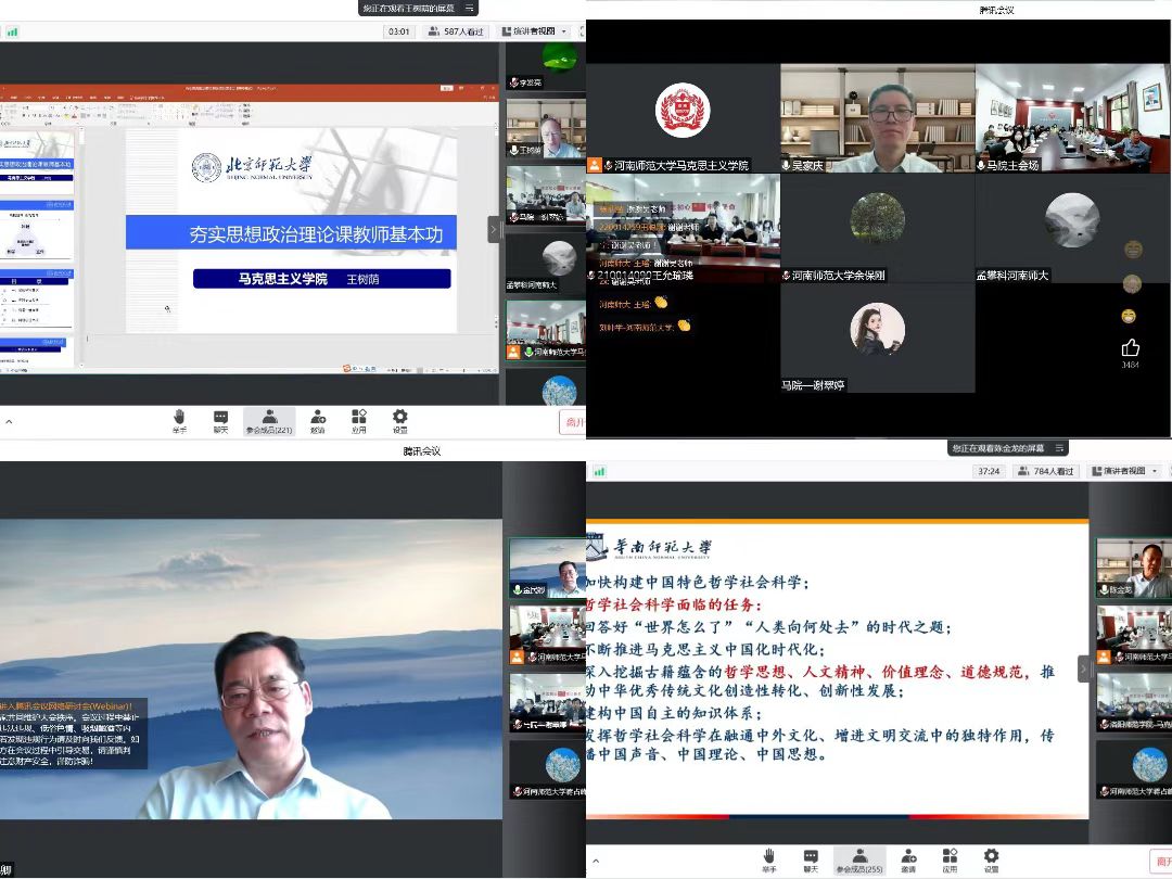 9月24日至25日,我院思政课教师集中在A3-305会议室通过线上方式参与培训学习。培训期间,国家社科基金学科评审组专家师吴家庆教授作题为“马克思主义理论论文撰写与发表”的学术报告;国务院学位委员会马克思主义理论学科评议组成员王树荫教授作题为“夯实思想政治理论课教师基本功”的学术报告;中央“马工程”首席专家、中国社会科学院近代史研究所党委副书记金民卿教授作题为“‘两个确立’的历史依据和时代基础”的学术报告;教育部长江学者、华南师范大学马克思主义学院院长陈金龙教授作题为“思政课教师研究能力的培养与提升”的学术报告。
