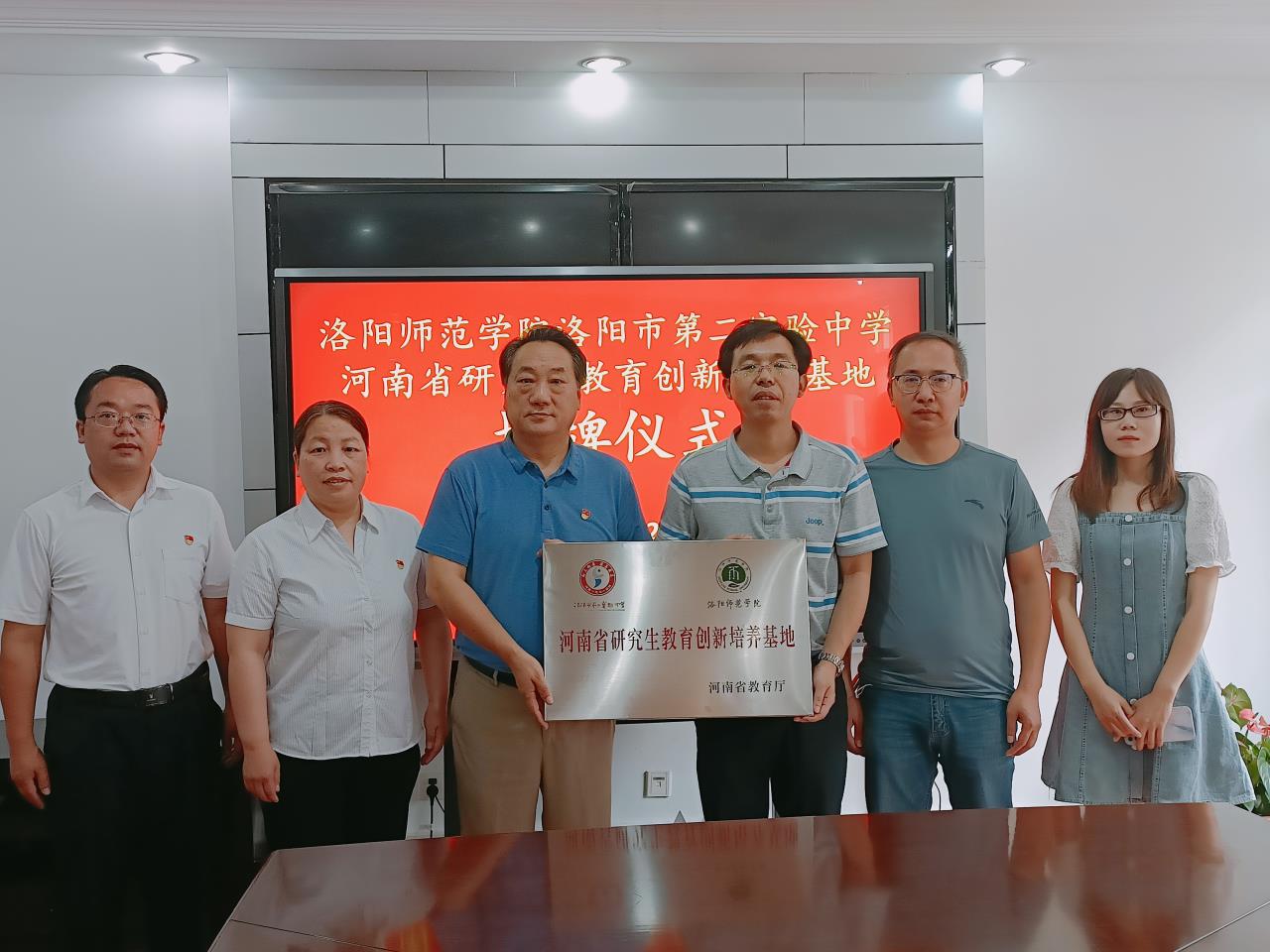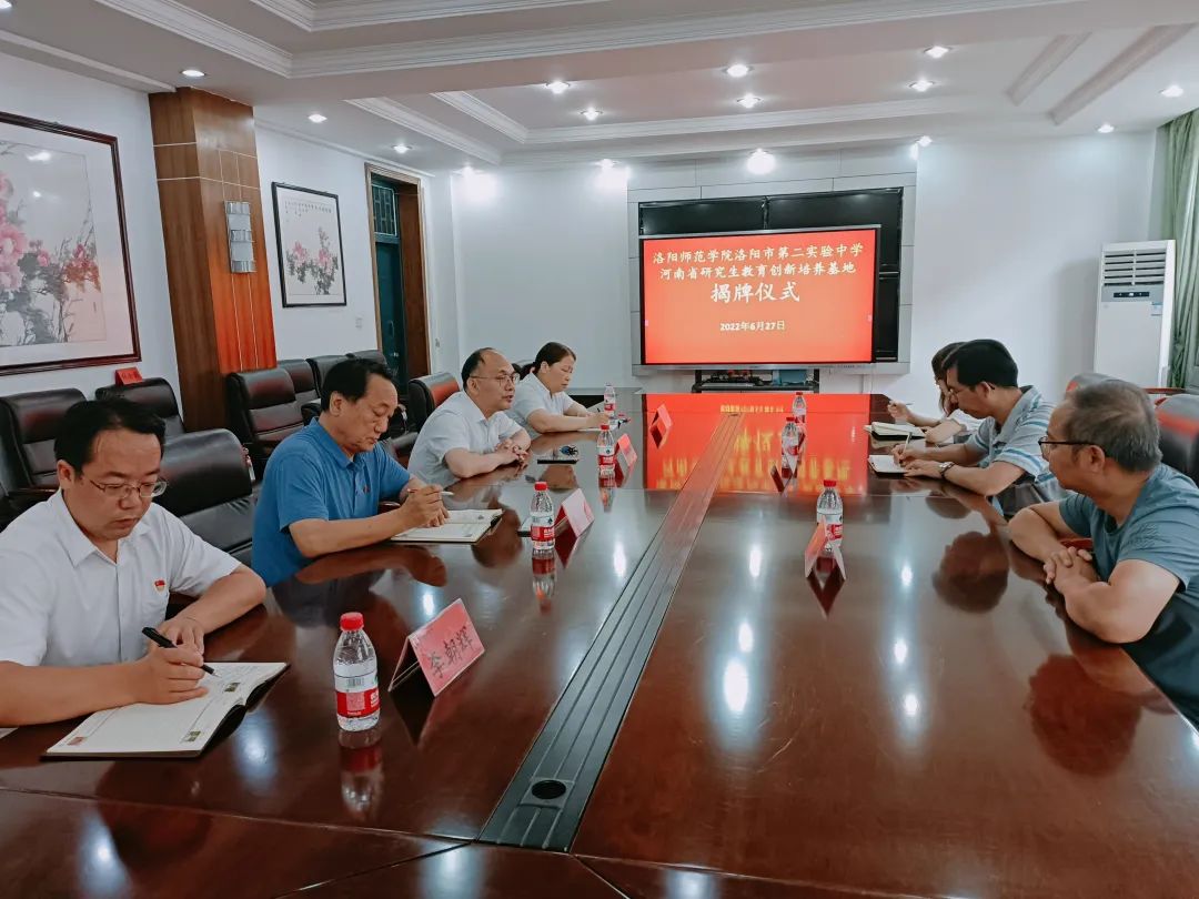 2022年6月27日上午,我院与洛阳市第二实验中学成功举行了“河南省研究生教育创新培养基地”揭牌仪式。参加此次会议的有我院院长吴胜锋、我校研究生处副处长谭勇刚、研究生秘书王菲菲以及洛阳市第二实验中学校长师利峰、党委书记韦忠民、副校长王东、李朝辉。
