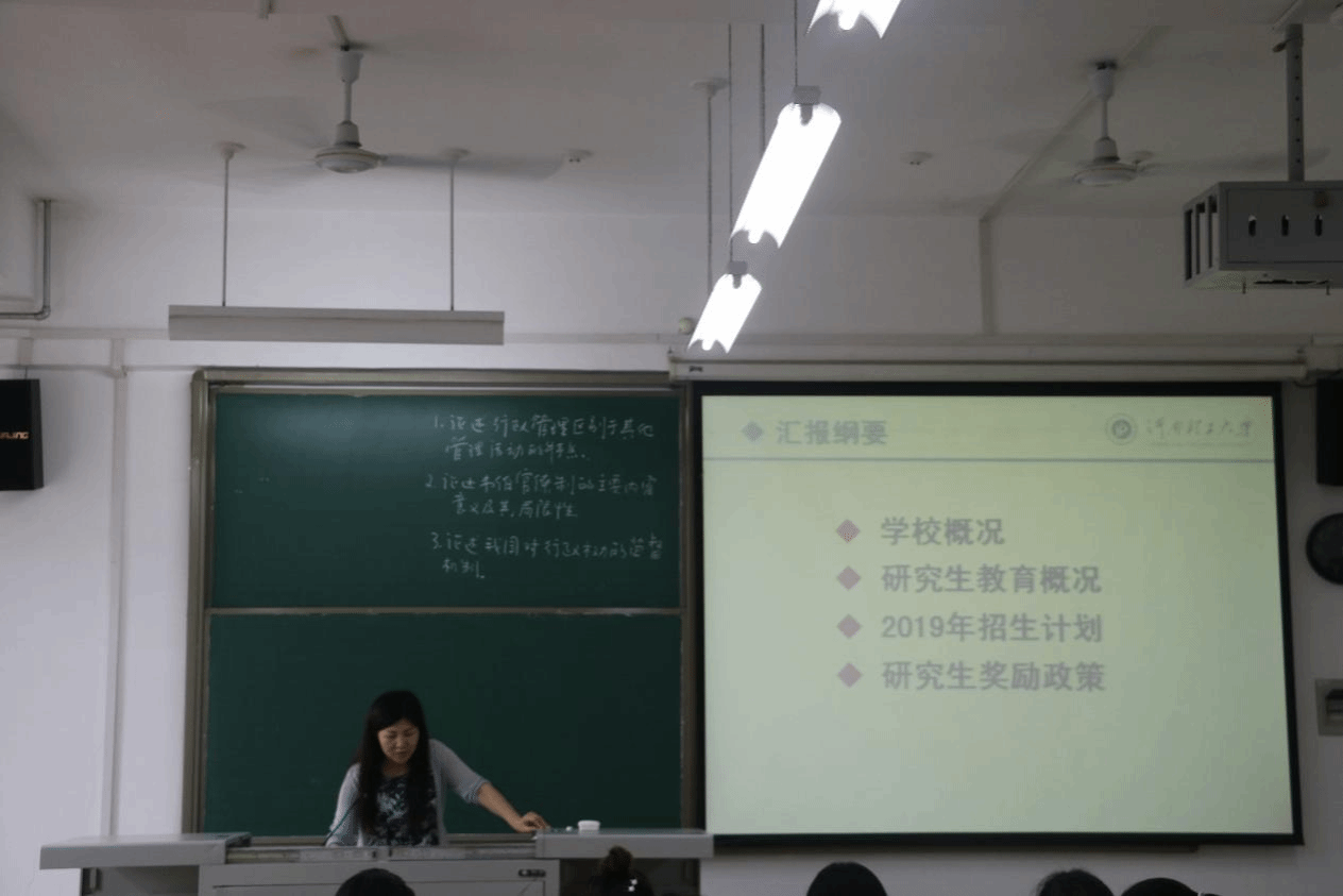 宣讲过程中,河南理工大学研究生院的丁亚红副院长向同学们详细介绍了河南理工大学的概况和现状,其中包括学位点发展,在校研究生规模,研究生教育成效等方面的具体情况,以及2019年河南理工大学研究生招生计划和研究生奖励体系,同学们就自己关心的问题向丁院长进行了咨询,丁院长耐心地一一给了回复。最后,她表示会和我院加强交流,欢迎同学们报考河南理工大学的研究生,河南理工大学欢迎大家。