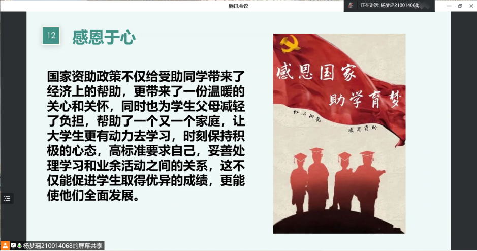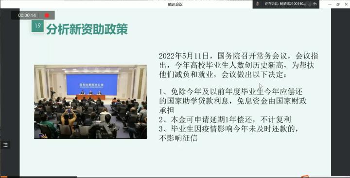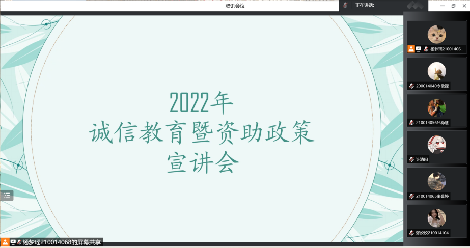 5月20日晚,我院医保资助部通过腾讯会议举办2022年诚信教育暨资助政策宣讲会,2022届毕业生积极参加。