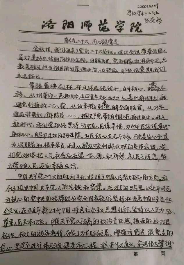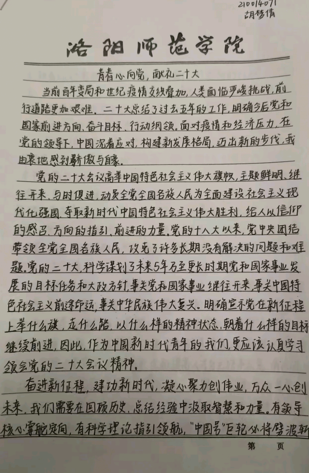 本次活动中,同学们认真书写了自己对于党的二十大精神的认识和理解以及对祖国未来的展望,表明要以青春力量推动中华民族奋进前行,将个人理想融入实现中华民族伟大复兴的中国梦中。其中,21级思政二班学生苏畅从“青年要坚定理想信念、敢于担当向前、能够吃苦耐劳、肯于砥砺奋斗”四个方面阐述了新时代中国青年的责任与使命,全文层次清晰、语句流畅,内容切合实际,读来令人精神振奋、情绪激昂,最终在众多作品中脱颖而出,荣获本次征文比赛一等奖。