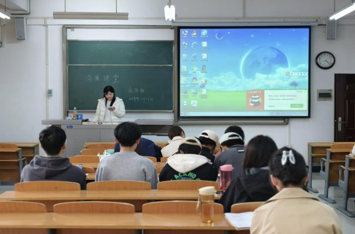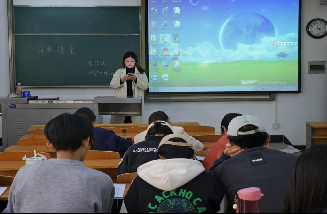 11月21日下午,马克思主义学院永信班在A3-307开展第三期“青廉讲堂”活动,此次活动由永信班团支书李肖倩主持,永信班全体学员参加。