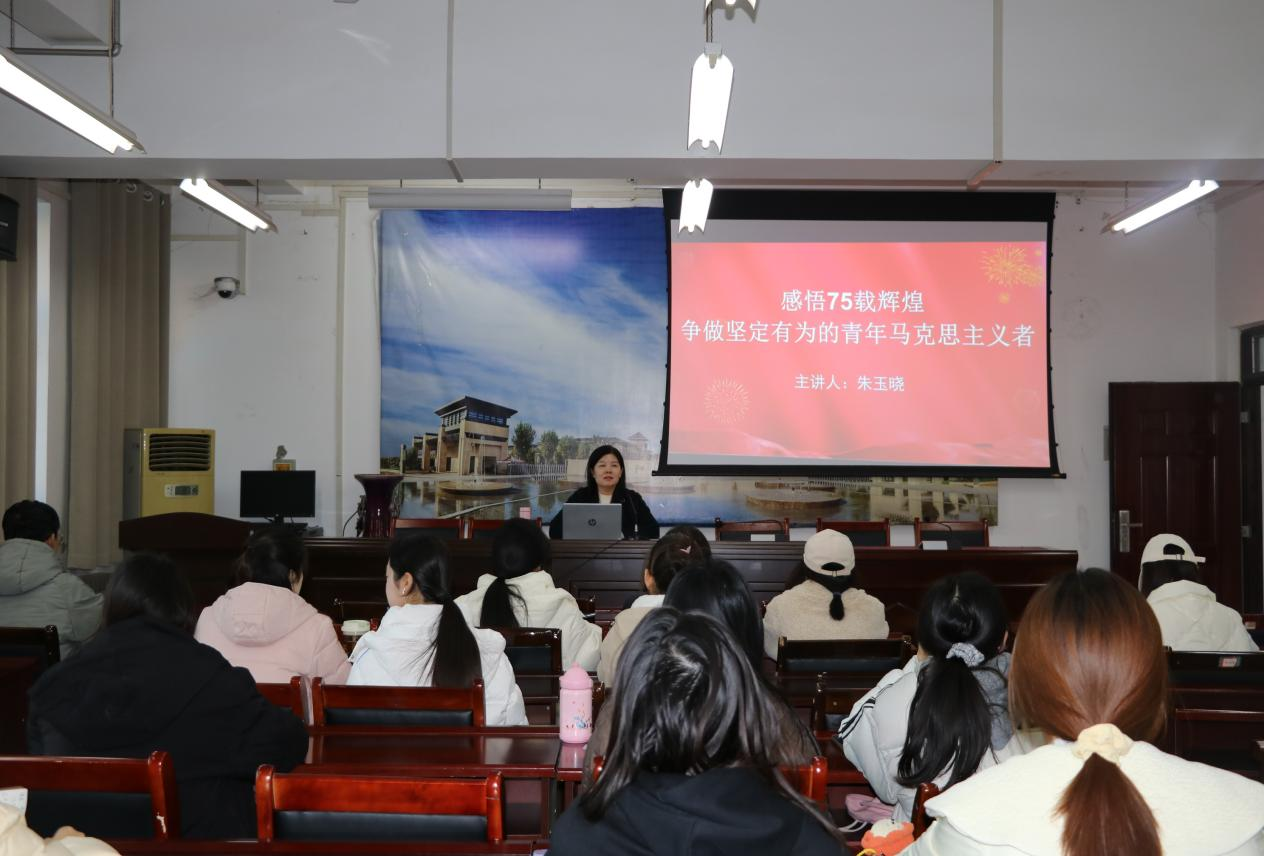 11月28日下午,我院党委副书记朱玉晓在A3-305教室以“感悟七十五载辉煌,争做坚定有为的青年马克思主义者”为主题开展理论讲座,我院“青马工程”永信班和外国语学院青马班全体成员参加。