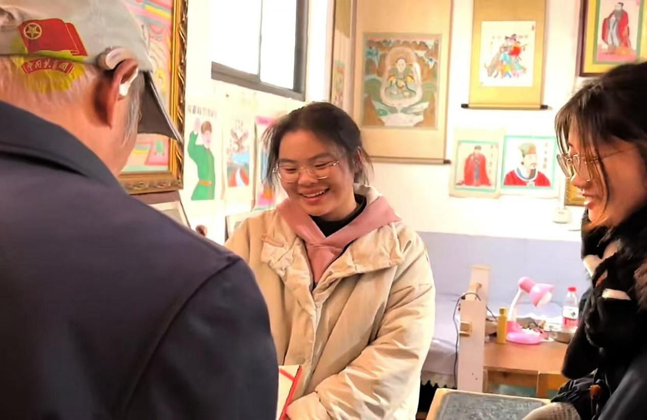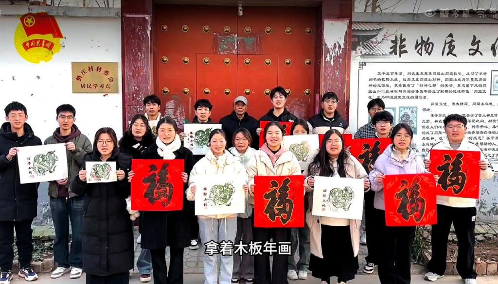 习近平总书记对青年一代寄予厚望,鼓励青年勇担时代使命,积极投身社会实践。在新春佳节万象更新、团圆希望满溢之时,问礼书院3号学生社区2311团支部的杨雯杰,积极投身于河南省新乡市获嘉县团委组织的“青年同行 文化获嘉”——返乡大学生寻访“中国同盟(封神)文化起源地”活动中。杨雯杰与其他志愿者一同走进家乡非物质文化遗产传承人张同瑞老师的传习所,沉浸式体验家乡木版年画这一非物质文化遗产的独特魅力,随后开展送春联下乡活动,将写满祝福的春联送到乡亲们手中,也把家乡的非物质文化遗产传播给更多人,让传统文化在新春之际绽放新的光彩。