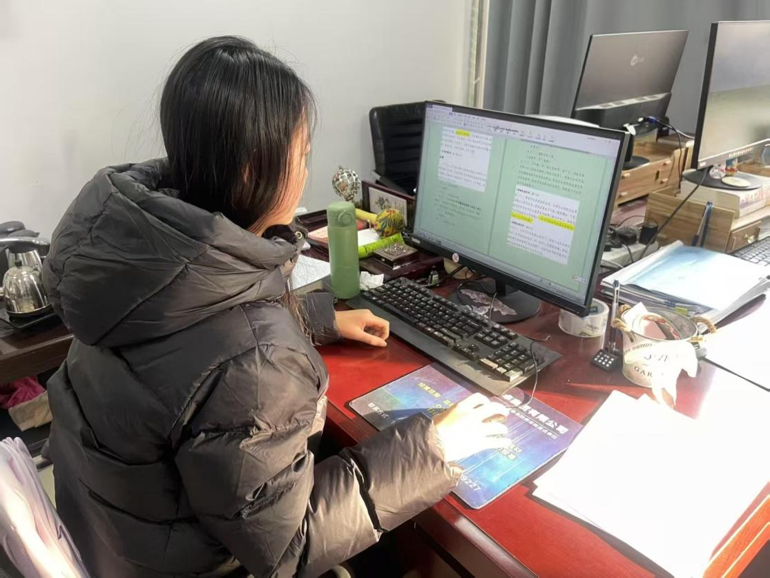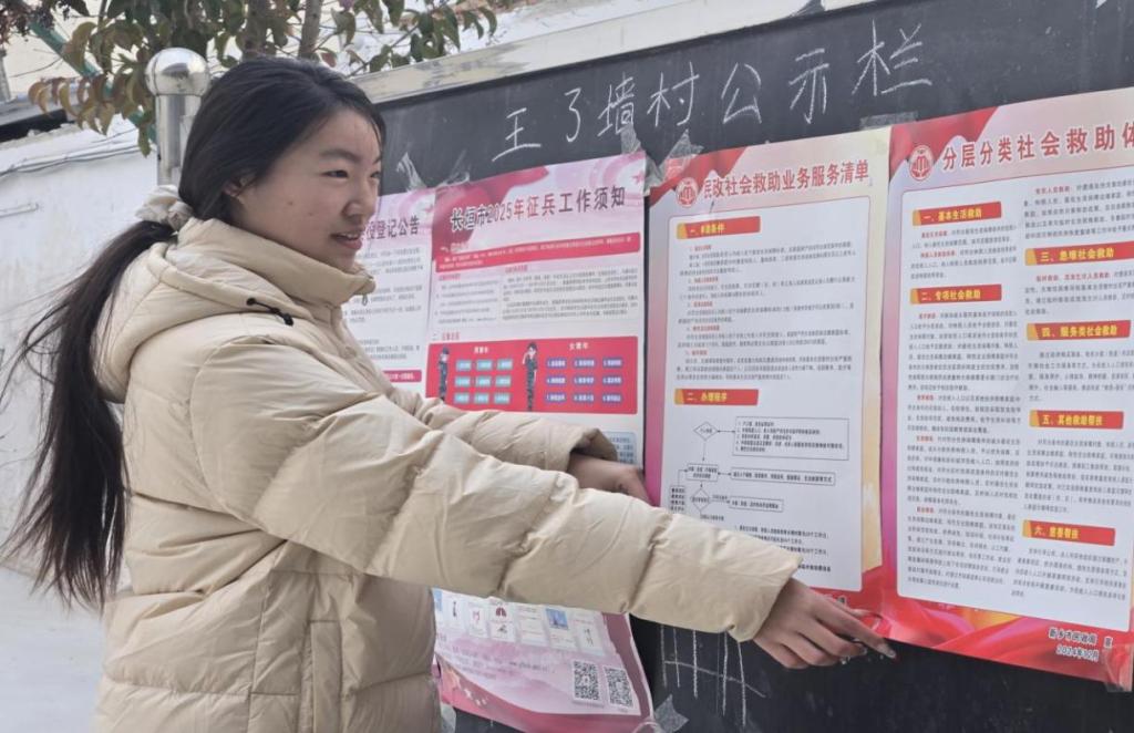 寒假返回家乡后,王子玉参加了河南省长垣市魏庄镇王了墙村的政务实践活动。她积极助力当地教育基金会工作,帮助文化程度有限的村民完成子女教育基金申请表格的填写、检查,确保每份承载地家庭希望的申请表能顺利提交。同时,她严谨认真地管理村公示栏,确保村务信息准确无误、清晰可读。春节期间,她还积极参与“青年普法志愿者 法治文化基层行”活动,发放法治宣传资料,解答群众法律问题,讲述防范电信网络诈骗的重要性,引导大家树立法治观念。