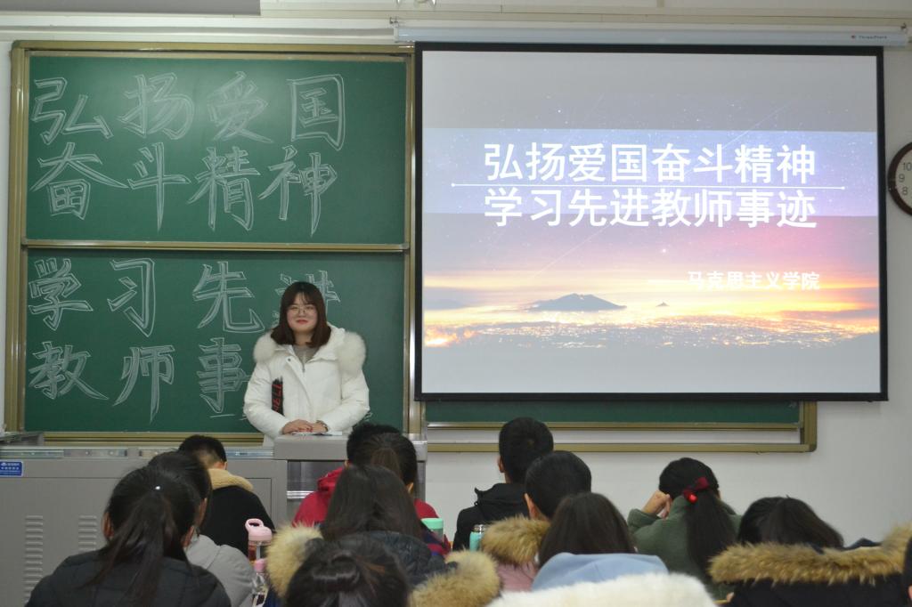 不忘初心、牢记使命。12月23日,我院2018级思想政治教育本科一班在A3–307教室举行题为“弘扬爱国奋斗精神,学习先进教师事迹”的主题班会。本次班会由班长王艺峰主持,2018级思想政治教育本科一班全体同学积极到场参加。