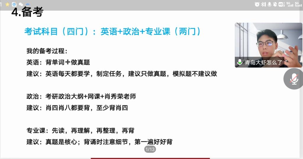 郭照杰、刘欣以自身经验为例从备考经验、面试技巧、调剂事项等方面为切入点,向学生们分享了考研经验,强调备战考研要加强理论知识、夯实专业基础、丰富英语阅读能力。郭照杰向大家重点分享了专业的背诵经验和计划,详细讲解了各科目的复习方法与技巧并推荐了复习书籍和网课资料。刘欣借助分享自身的考研经历为学生们提供了学习建议和心态调整的方法,并指出考研是一场持久战,备战学子要在考研期间放松心态,保持自己的节奏。
