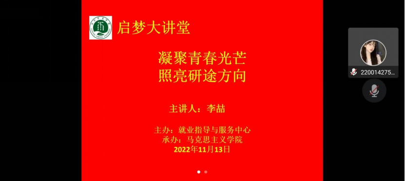 11月13日上午,由就业指导与服务中心处主办,我院承办的启梦大讲堂通过腾讯会议举行。文都考研政治辅导老师李喆担任本次讲座的主讲人,我院大四考研学生积极参加。