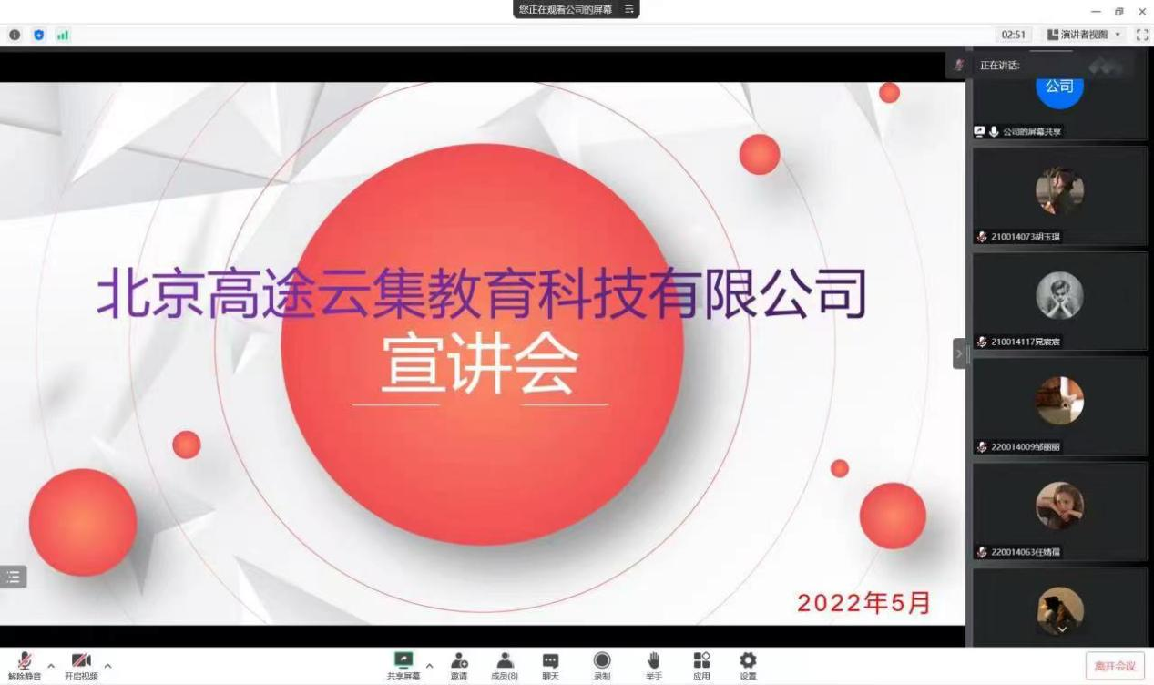 2022年5月27日下午,我院承办高途课堂专场宣讲招聘会,会议由高途教育人事专员张延城主讲,我院积极动员有求职意愿的学生参会。