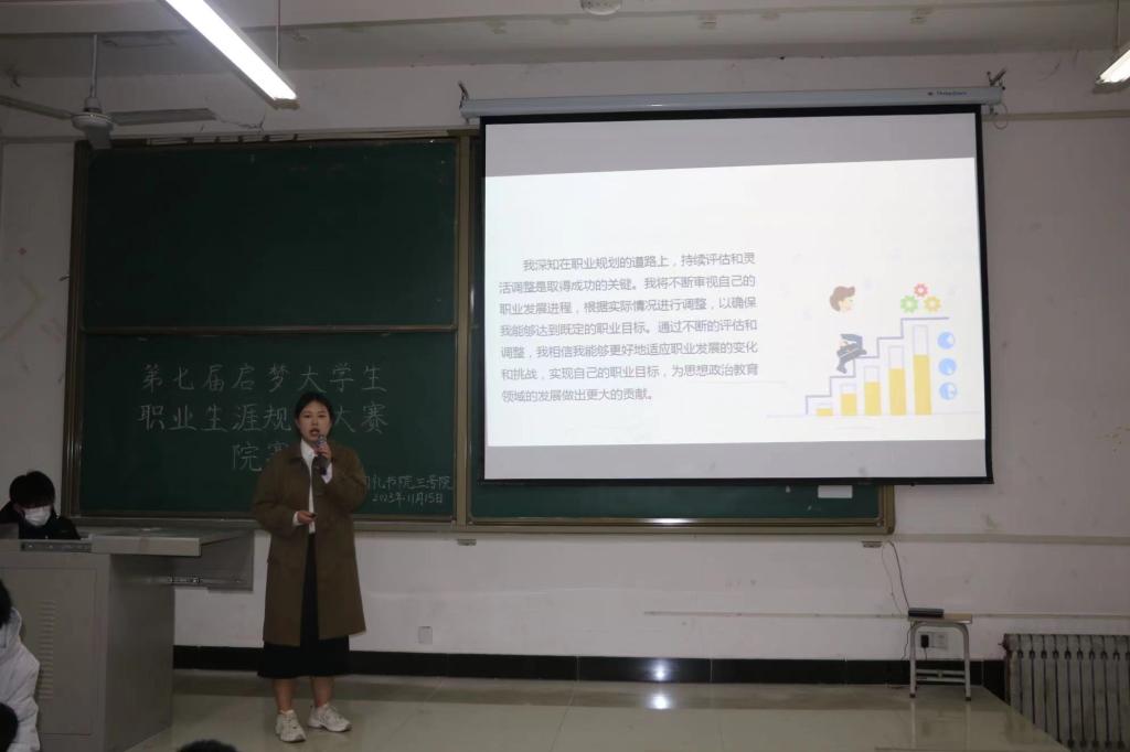 11月15日晚上,我院联合外国语学院在A1-101教室举办问礼书院三号院职业生涯规划大赛。本次大赛邀请到扈琼琳、任威豪、李安静、杨强博、李睿通五位指导教师担任比赛评委。我院共选拔八名选手参加本次比赛,2023级学生积极到场观看。