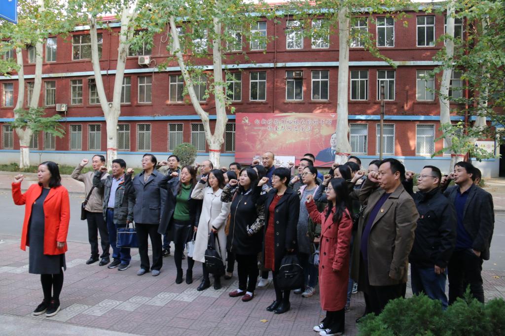 在解说员的讲解下,大家怀着无比崇仰的心情,深入学习了解焦裕禄同志在洛矿工作期间的点点滴滴,一张张历史图片,一件件生活用品,一个个感人的故事,生动地展现了焦裕禄同志在洛矿奋斗的历程。尤其是主持研发制造新中国第一台2.5米双筒卷扬机的事迹,焦裕禄同志不畏难、不服输,要在困难面前逞英雄,45天没有回家,困了躺在长条凳上眯一会,最终带领工友们完成了苏联专家都认为不可能完成的任务。在焦裕禄同志铜像前,在王向华老师的带领下,大家重温入党誓词。