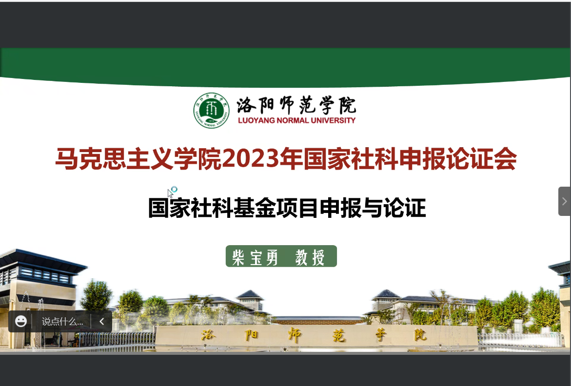11月19日晚,我院举行了2023年国家社科基金申报论证会。论证会采用线上方式进行,中国社会科学院大学柴宝勇教授远程指导。校科研处处长刘恒、副处长李竞强,我院院长吴胜锋、副院长牛子宏和拟申报国家社科基金项目的相关教师参会。会议由牛子宏主持。