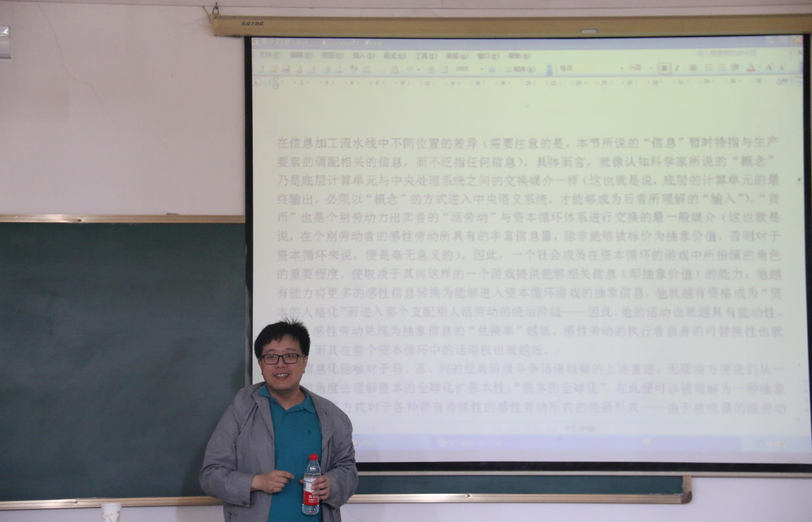 首先,徐教授讲道:“根据《共产党宣言》的原始描述,资本主义的全球化将自然地为无产阶级的全球化联合开辟道路。因此,马列经典作家的“阶级”概念显然具有超越地域局限性之内涵。然而,最近全球各国出现的“逆全球化现象”,却大有以民族地域为界,分裂各国劳工利益之意蕴。这一现象虽在表面上与经典作家的预见产生冲突,却依然可以在一种升级版本的唯物主义解释框架中得到安顿。这种新解释框架能够解释:一,为何超越于地域限制的“阶级”概念并非马克思主义者的臆造,而是在一定的解释层面上具有一定的“实在性”的;二,为何处于“异化”现实中的个体对于其自身“阶级地位”的反思性知识是如此难以被获取;三,为何在资本的全球化扩张与无产者的全球化联合之间,尚没有出现马、恩所预报的直通车效应。”接着,徐教授对于上述问题的详细解答的作用归结为:一方面将为目前作为“逆全球化”现象之推手的“民粹主义”思潮的出现,提供一种更富唯物论色彩的诊断意见;另一方面也将为“重建巴别塔”的可能性,提供学理依据。最后,徐教授结合我国的经济发展现状提出:人工技能技术在我国的发展所难以避免的工业劳动力闲置问题,也必将倒逼我们将更多的人类劳动力投入到机器难以复制的领域去。这一观点也引发了大家的深思。