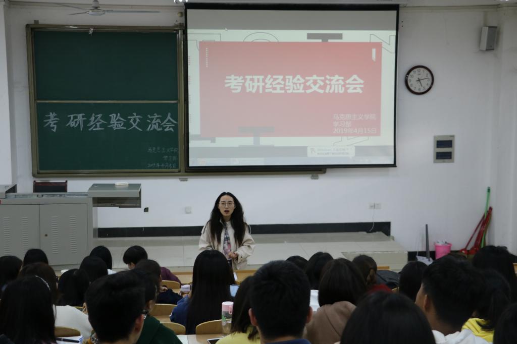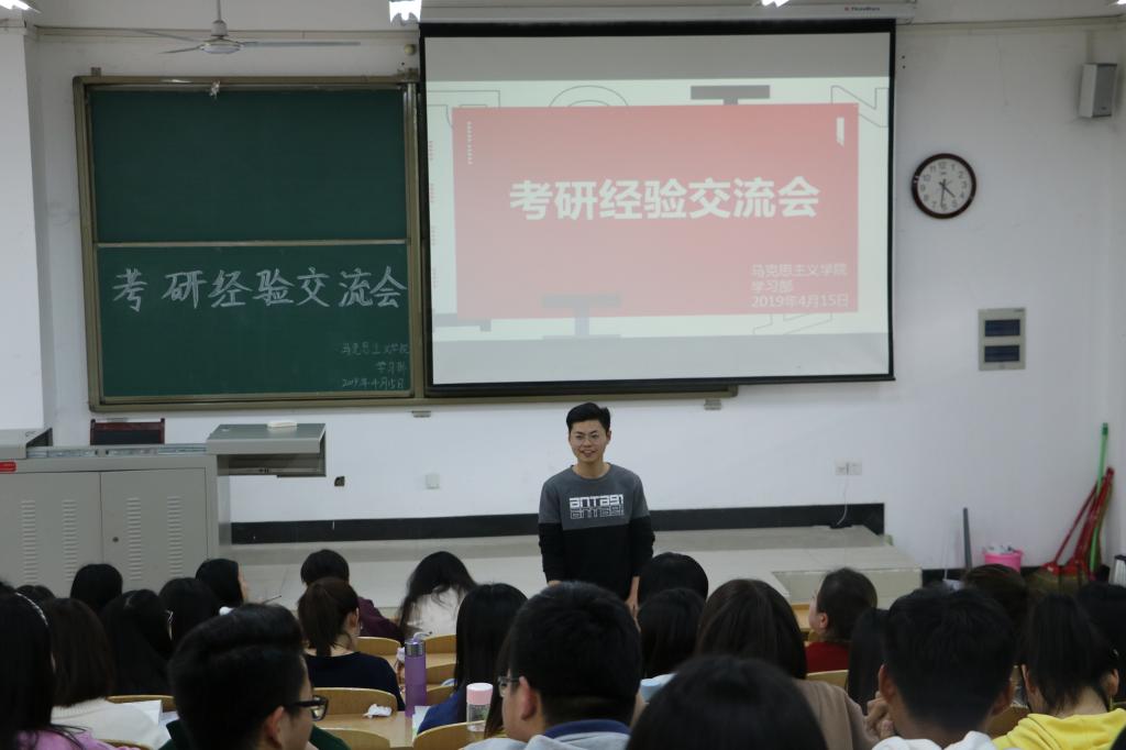 为了给我院2016级学子传授更多考研经验,4月15日下午,我院邀请了在2019年研究生考试中取得优异成绩的郭照杰、罗原生、徐亚欣、陈佳颖、戴宇政、翟笑霞等几名同学于A3-114教室对2016级学生进行考研指导,2016级全体学生及2017级部分学生积极到场聆听。