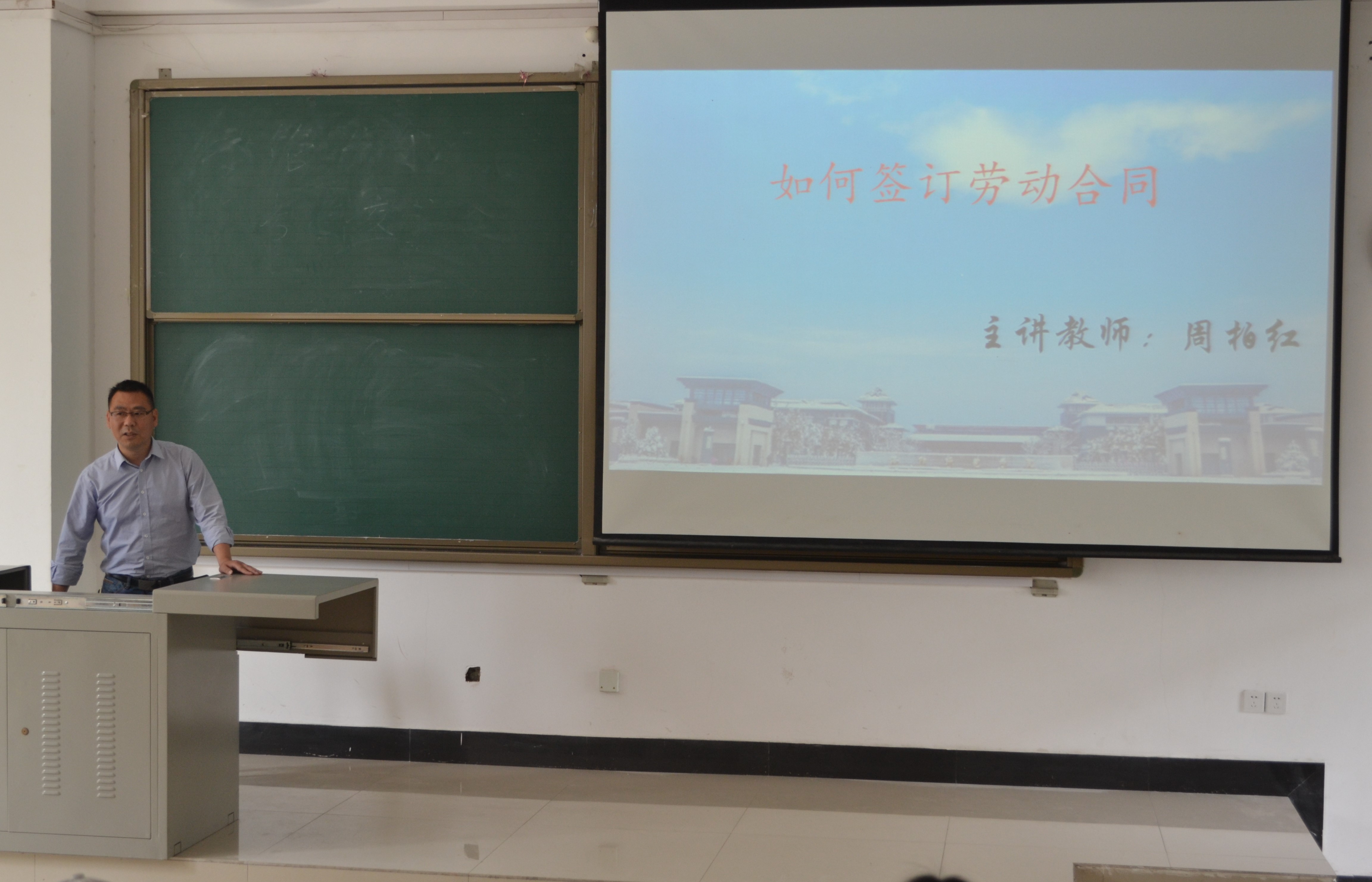 为增强学生法治意识,树立正确的法制观念,5月11日下午,我院于A3—114教室开展“树立法制观念,做新时期合格团员”主题讲座,周柏红老师担任本次讲座主讲人,14、15级学生积极参与聆听,讲座由团总支书记张宁主持。 周柏红老师从“劳动合同概述、签订劳动合同的准备、劳动合同的内容、签订劳动合同时的注意事项”四方面为大家讲述了“如何签订劳动合同”。首先,周老师指出,劳动合同就是劳动者和用人单位之间关于确立、变更和终止劳动权利和劳动义务的协议,同学们在此类合同时应该先认真分析自己所要选择的工作,并了解用人单位的基本情况;接着,他把劳动合同中的必备条款与约定条款分别向大家作了介绍,并向同学们强调了要在签订劳动合同时注意禁止担保、约定服务期、不要签订空白合同、合同签字盖章后劳动者应索要一份等八点注意事项。在讲解过程中,周老师引用案例,生动形象地将“如何签订劳动合同”的相关知识讲授给大家,同学们细心聆听,认真记录。