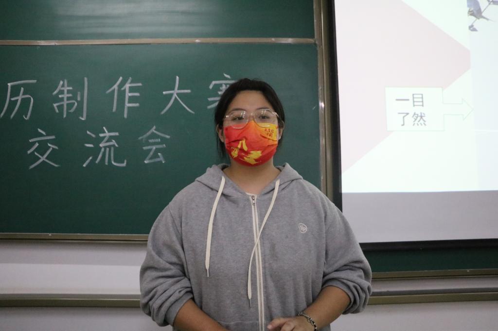 会议伊始,韩诗怡向同学们展示自己的参赛简历,并向大家介绍了简历的构成要素,即封皮、个人简历、自荐信和附件。随后她从每个要素分别展开叙述。她谈到,一份合格的简历不但要从招聘者的角度突出自身优势还要兼顾美感,使内容更加清晰明了,让人一目了然。接着马海军分享了自己的制作经验。他向大家展示了不同风格的简历模板,重点强调教育背景、实践经历、技能介绍、自我评价四个方面的制作技巧,并指出简历制作要条理清晰,适当运用图标来突出重点。最后燕文惠向同学们提出建议,希望同学们通过简历制作大赛认清自身优势与不足,从而明确下阶段的发展目标。