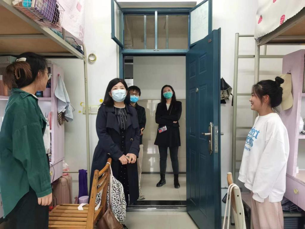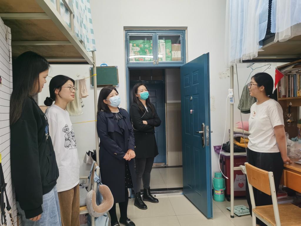 朱玉晓一行仔细察看了学生的居住环境,并与同学们亲切交谈。在谈话过程中了解同学们封校期间的学习、生活情况,实地听取学生意愿诉求,及时妥善解决学生学习、生活方面的实际困难。朱玉晓逐一走访了大四毕业生宿舍,她亲切询问了大四毕业生考研、就业情况,并鼓励学生积极准备毕业事宜,缓解学生思想压力。在低年级学生宿舍走访过程中,她嘱咐低年级学生要珍惜学习时间,及早明确目标,并为之努力奋斗。最后,朱玉晓叮嘱学生们要理解并配合学校的疫情防控政策,有困难及时联系老师。