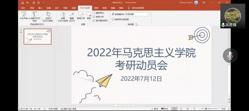 炎炎夏日,骄阳似火。为了鼓励考研学生专心复习,缓解压力,根据学校考研工作部署,7月12日晚,我院通过腾讯会议平台召开了暑期考研动员会。党委书记朱胜利、院长吴胜锋、副院长李发亮、党委副书记朱玉晓、思想政治教育系主任王现伟、19级思政班班主任徐宁、张俊红、19级思政班辅导员刘思嘉和19级部分考研学生参加会议。会议由王现伟老师主持。
