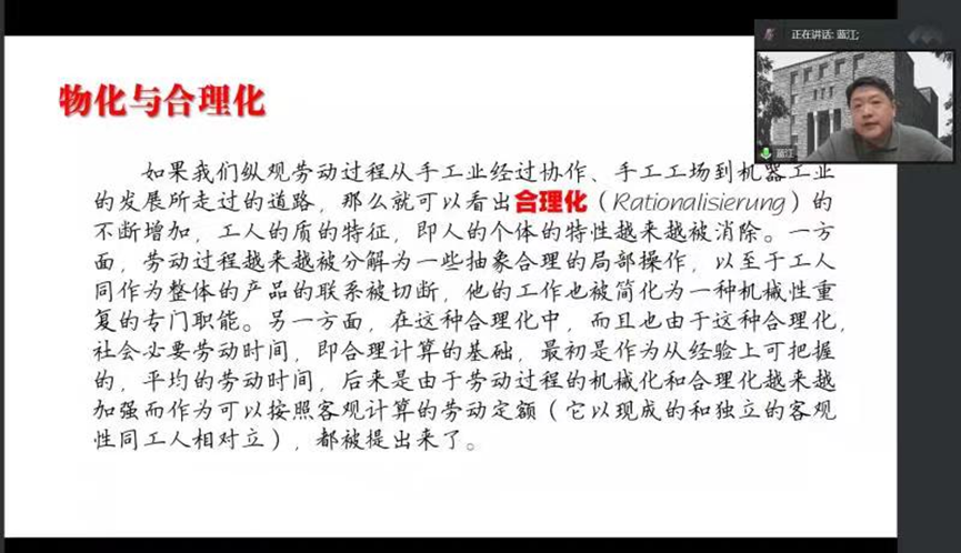 10月9日晚,南京大学哲学系蓝江教授应邀作了题为“从物化批判到数字资本:西方马克思主义的演变历程”的线上学术讲座。讲座由我院院长吴胜锋主持,学院全体教师和研究生参加。