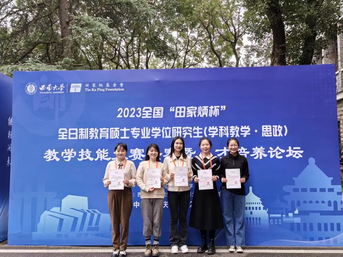 12月1日至3日,2023年全国“田家炳杯”全日制教育硕士专业学位研究生学科教学(思政)教学技能大赛决赛在西南大学成功举办。我院2022级研究生李思懿、陈笑蝶荣获一等奖,杨珊珊、徐雨凡、黄海晴荣获三等奖。黄淑婷、扈琼琳老师荣获“优秀教师指导奖”,其中一等奖数量位居全国参赛高校第二。