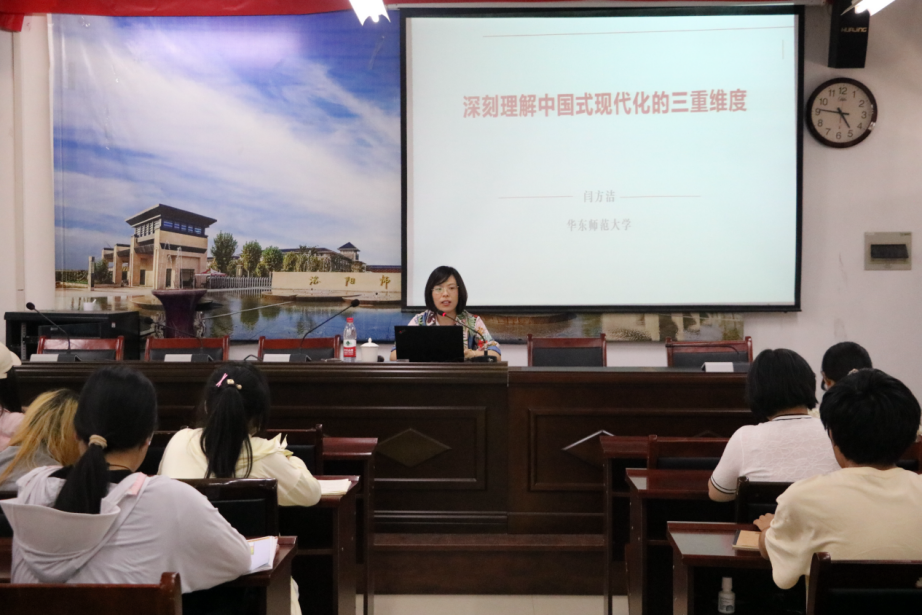 6月25日下午,华东师范大学马克思主义学院闫方洁教授莅临我院,在A3-305会议室进行了一场题为《深刻理解中国式现代化的三重维度》的学术讲座。讲座由副院长牛子宏主持,学院部分老师和学生聆听了此次讲座。
