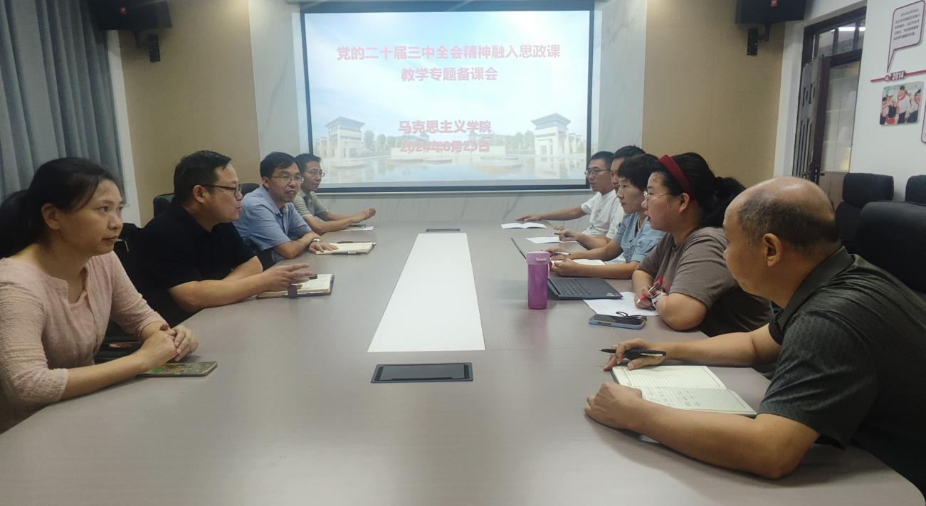 为深入学习贯彻党的二十届三中全会精神,及时将党的理论创新成果融入思政课教学,8月29日,马克思主义学院在A3-407会议室召开党的二十届三中全会精神融入思政课教学专题备课会。院长吴胜锋,副院长李发亮、田江太及各个教研室主任参加此次集体备课会。
