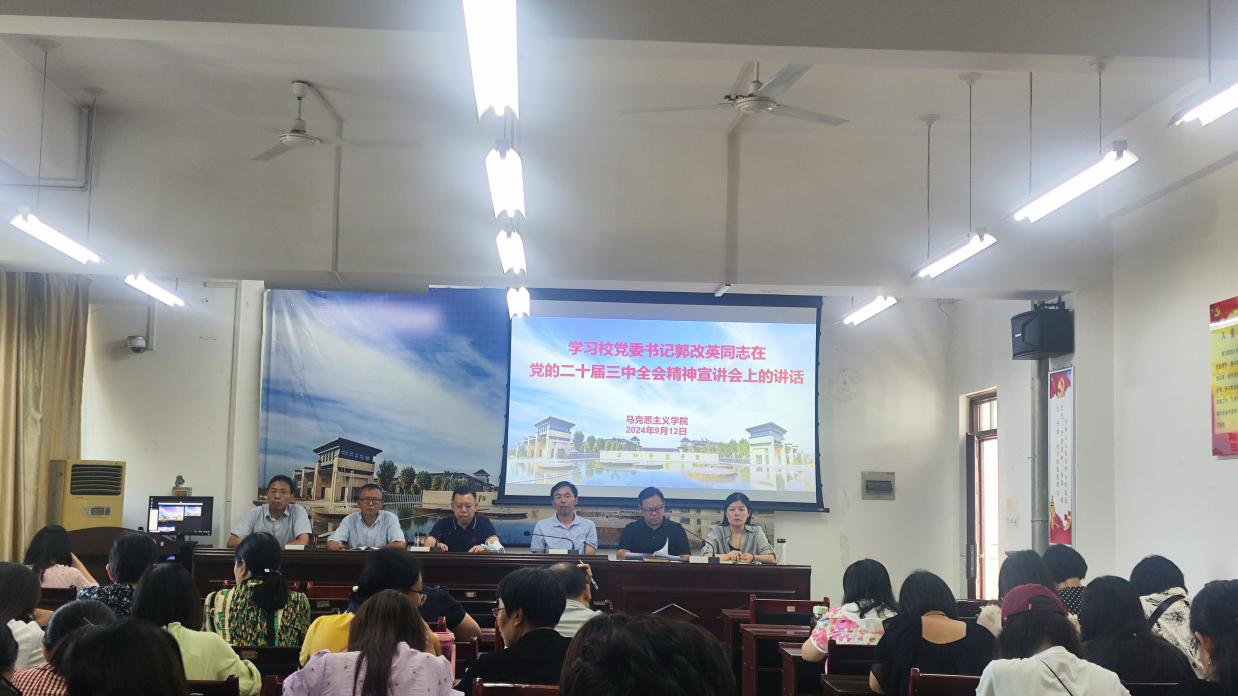 为深入学习宣传贯彻党的二十届三中全会精神,扎实推动全会精神融入学院各项工作,9月12日下午,马克思主义学院在A3-305召开专题会议,学习校党委书记郭改英同志在党的二十届三中全会精神宣讲会上的讲话。会议由学院党委书记吕鹏主持,学院领导班子以及全体教职工参加会议。