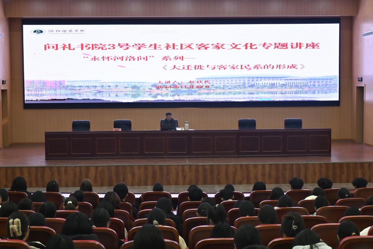 举办专题讲座,感受客家文化。书院社区特别邀请洛阳客家联合会党支部书记、洛阳师范学院马克思主义学院原党委书记赵社民做专题分享。赵社民以“永怀河洛间”系列——《大迁徙与客家民系的形成》为主题,系统讲述了何谓客家及客家民系、客家民系形成及发展的历史过程、客家民系形成的特征三个方面的内容,勾勒出了客家人古往今来的历史轮廓,揭示了其深厚的历史底蕴和文化特色。本次讲座使同学们深刻体会了客家文化的深厚底蕴,进一步激发了同学们传播中华文化的热情,大家纷纷表示将在之后的学习生活中担当作为,努力讲好中国故事,争做中华文化的传播者、发扬者。