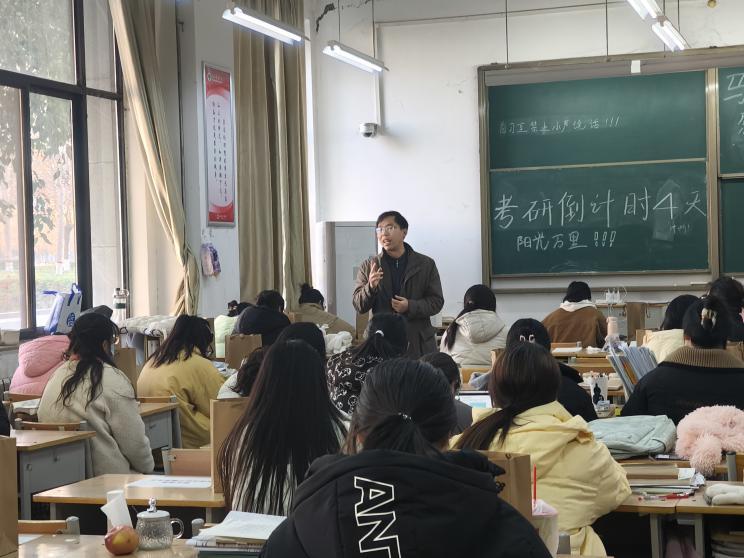 为鼓舞考研学子的士气,增强考研信心,缓解备考压力,12月17日下午,马克思主义学院组织开展慰问考研学生活动。我院党委书记吕鹏、院长吴胜锋、党委副书记朱玉晓、副院长李发亮、田江太以及毕业班班主任王秀秀来到A3-106教室慰问考研学生。