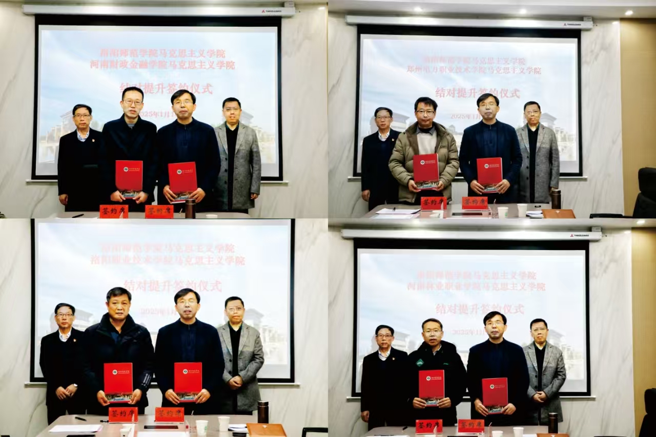 为深入学习贯彻党的二十届三中全会精神和习近平总书记关于思政课建设的重要指示,根据中共河南省委宣传部、中共河南省委教育工委、河南省教育厅印发的《河南省高校马克思主义学院结对提升工作方案的通知》(豫教工委〔2024〕175号)要求,1月16日,我校马克思主义学院与河南财政金融学院、河南林业职业学院、洛阳职业技术学院、郑州电力职业技术学院等四所高校马克思主义学院在A3-407会议室举行现场签约仪式。