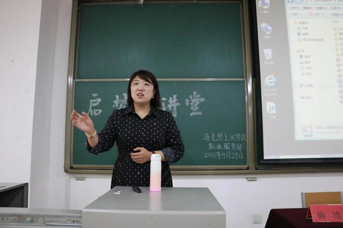为提升师范生教学能力,帮助我院本科生做好职业生涯规划。4月29日下午,由校就业指导与服务中心主办,马克思主义学院承办的启梦大讲堂活动在A3-114开展。本次讲座邀请到洛阳市二十三中副校长、河南省学术技术带头人杨洁进行分享。马克思主义学院党委书记朱胜利、学工办主任刘思嘉、就业办主任扈琼琳出席,2019级、2020级本科生积极到场聆听。