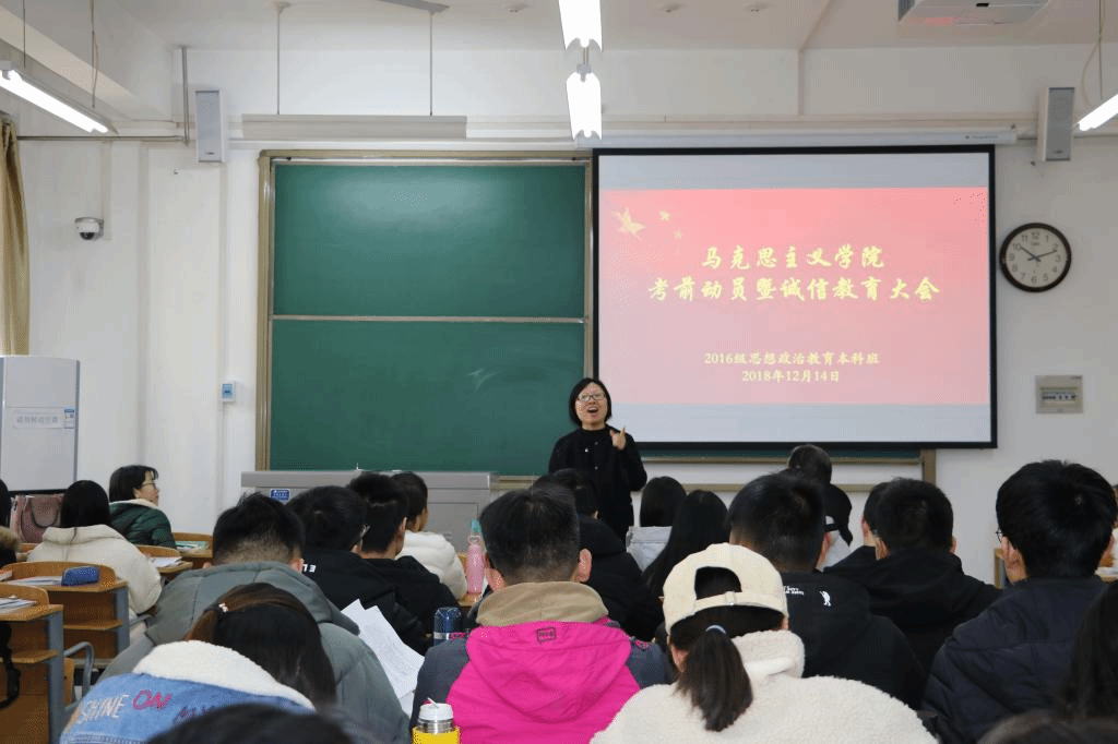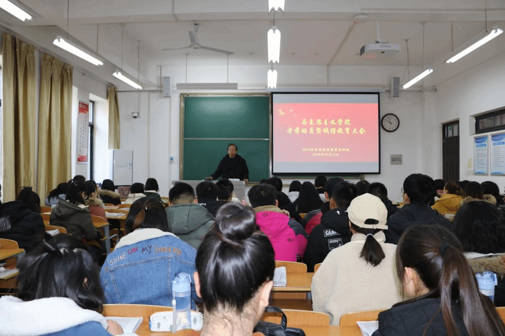 临近2018年12月全国大学英语四六级考试、2019年全国硕士研究生统一招生考试和学校期末考试,12月14日,我院党总支副书记王磊、2016思想政治教育本科班辅导员张宁在A3-307教室开展了考前动员暨诚信教育大会,我院2016级学生到场聆听。