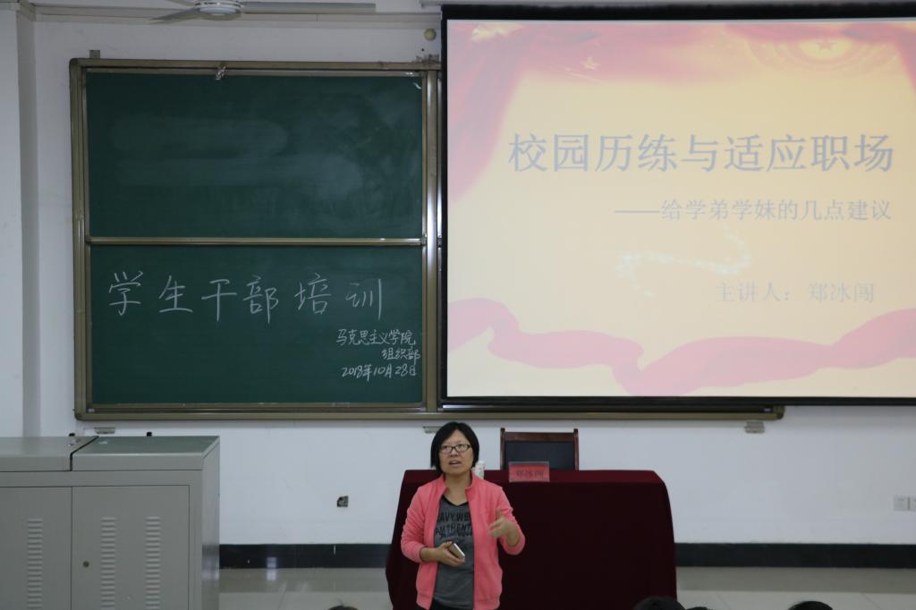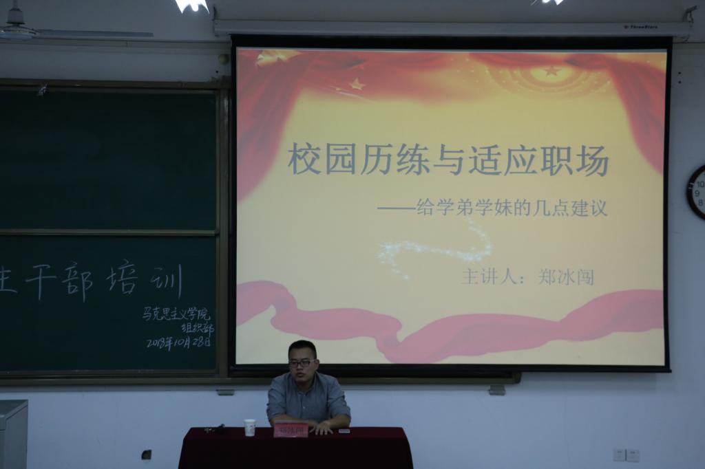 会议开始郑冰闯老师通过讲述自己学生时期担任学生干部的经历拉近了与全体干部的距离,并由此引申出会议主题——校园历练与适应职场。他从“为什么要当学生干部,学生干部对你的影响和怎么做好学生干部工作”这三方面展开本次培训内容。他表明作为一个学生干部要树立正确的世界观、人生观、价值观,要把工作当成生活的一部分并正确的认识学生干部的身份。学生干部的经历不仅仅会丰富大学生活更能培养逻辑思维能力,提升实践能力,为今后工作奠定基础。接着他着重强调学生干部是全体学生中的优秀团体,要时刻注意自己的言行举止,牢记自己学生与干部的定位,把握社团、学习、生活三种身份,摆正心态积极做好每一件工作,并在此基础上突出尊师重友的重要性。最后郑冰闯老师将“但行好事,莫问前程,顺其自然,不是两手一摊的不作为,而是竭尽全力的不强求”送给参加这次培训的全体学生干部。