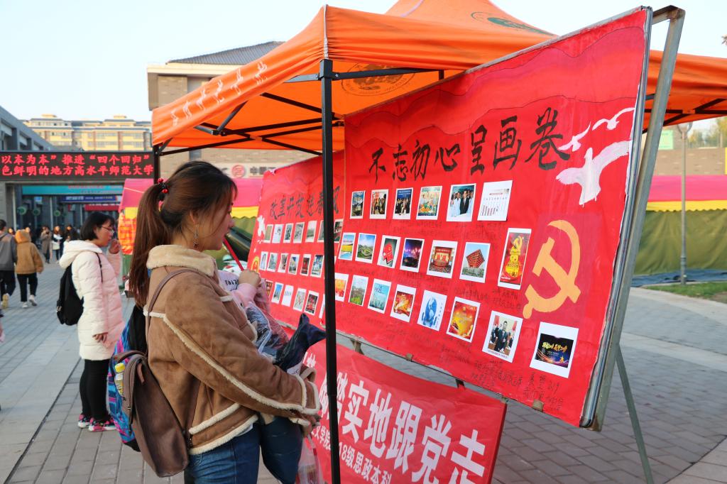 回顾过往的辉煌,谱写未来的篇章。本次活动展出两块展板共计四十余张有关我国发展历程的照片。“改革开放”主题展板以红色为主色调,以时间为线,生动形象的将我国改革开放以来所取得的重大成就逐一展现。“不忘初心”主题展板仍选用红色为底色,着重展现自改革开放后我国的变化。展板展出后,前来观看的同学络绎不绝,并对此赞叹不已。 “作为新时代的青年,祖国的巨大变化让我感到无比自豪,我会铭记先辈们的努力,不忘初心,继续前进”一位参观展板的同学如是说道。