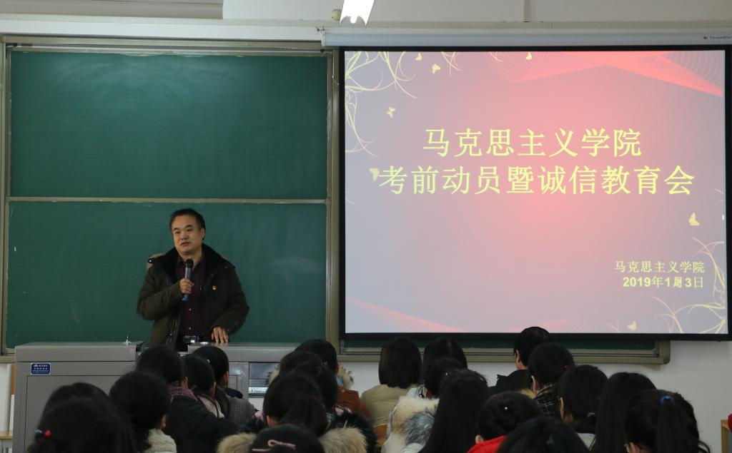 为端正我院学生考试态度,严肃考风考纪,增强诚信意识,保证本学期期末考试各项工作的顺利开展,督促同学们以积极的姿态迎接考试。1月3日上午,我院2018级思想政治教育本科班于A3-309教室开展考前动员暨诚信教育大会。我院副院长刘晓,党总支副书记王磊,2018级辅导员陈安琦出席会议,2018级学生积极到场聆听。