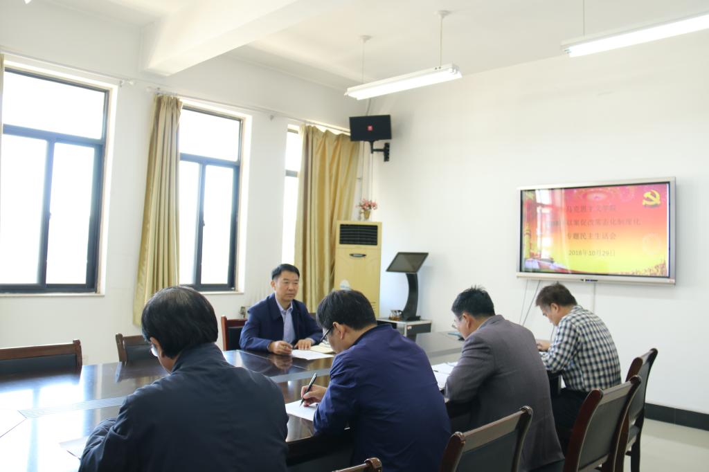 10月29日上午10点,马克思主义学院领导班子在A3-407会议室召开2018年以案促改制度化常态化专题民主生活会。校党委书记王洪彬、马克思主义学院领导班子全体成员参加了会议。会议由马克思主义学院党总支书记赵社民主持。