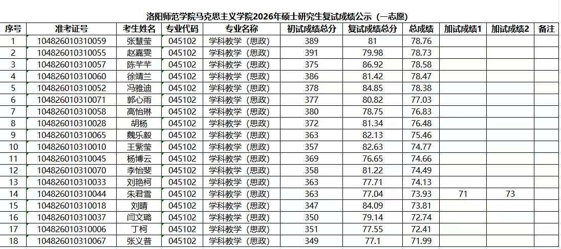 根据教育部《2026年全国硕士研究生招生工作管理规定》(教学函〔2025〕2号)、《洛阳师范学院2026年硕士研究生复试录取工作办法》等文件精神,我院于2026年3月28日组织开展了2026年硕士研究生复试工作。经专业课笔试、外语能力测试、综合素质面试等环节,已全部完成2026年我院研究生招生复试(第一志愿)工作,复试成绩已报学校审核备案,现公示如下: