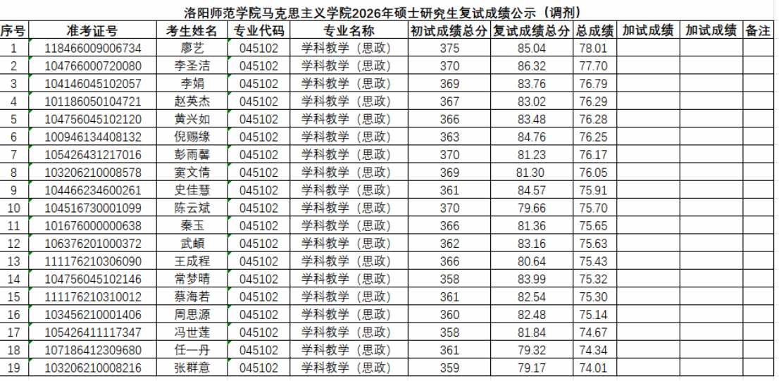 根据教育部《2026年全国硕士研究生招生工作管理规定》(教学函〔2025〕2号)、《洛阳师范学院2026年硕士研究生复试录取工作办法》等文件精神,我院于2026年4月11日、4月12日组织开展了2026年硕士研究生复试工作。经专业课笔试、外语能力测试、综合素质面试等环节,已全部完成2026年我院研究生招生复试(调剂)工作,复试成绩已报学校审核备案,现公示如下: