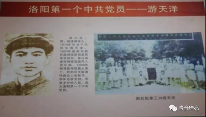 洛阳的第一个中共党员游天洋,他于1921年发展白眉珊和王福顺同志入党。之后洛阳的第一个中共党组织——中共洛阳组就此诞生了。他广泛阅读进步书籍并接受马克思主义的熏陶。1920年受命前往洛阳,宣传革命理论,创办工人补习学校,开展工人运动。其中最著名的便是陇海铁路大罢工运动。1922年冬因劳累过度,突发脑溢血在郑州辞世,年仅21岁。中华人民共和国成立后,中央人民政府追认其为革命烈士。