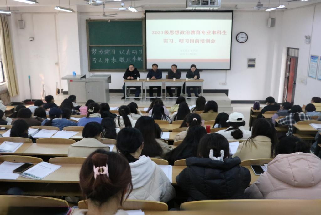 2月29日下午,我院在A3-114教室召开2021级思想政治教育专业本科生实习、研习岗前培训会,我院党委书记朱胜利、院长吴胜锋、副书记朱玉晓、副院长李发亮以及全体2021级本科生参加。会议由王向华老师主持。