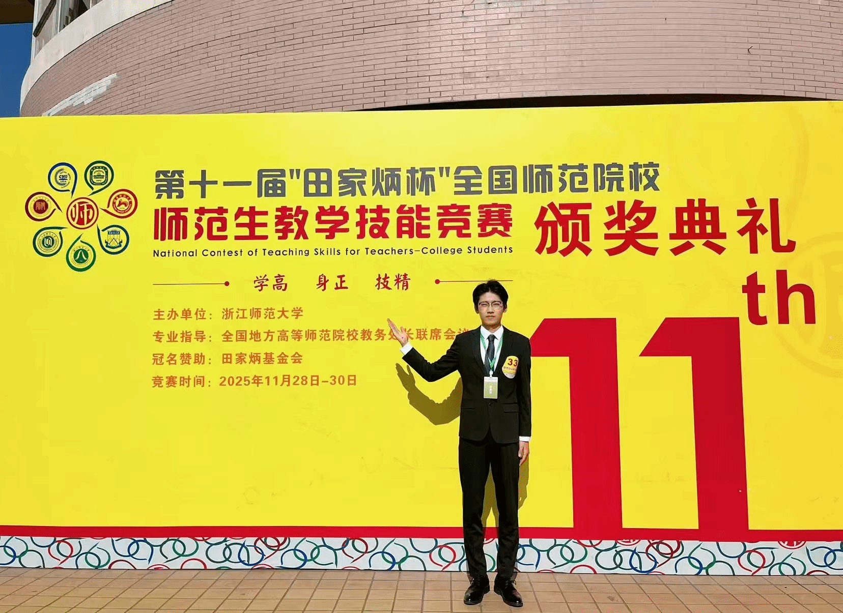 近日,第十一届“田家炳杯”全国师范院校师范生教学技能竞赛在浙江师范大学圆满落幕。我院2023级本科生王权同学凭借扎实的专业功底、精湛的教学技艺与从容的临场发挥,最终荣获二等奖。