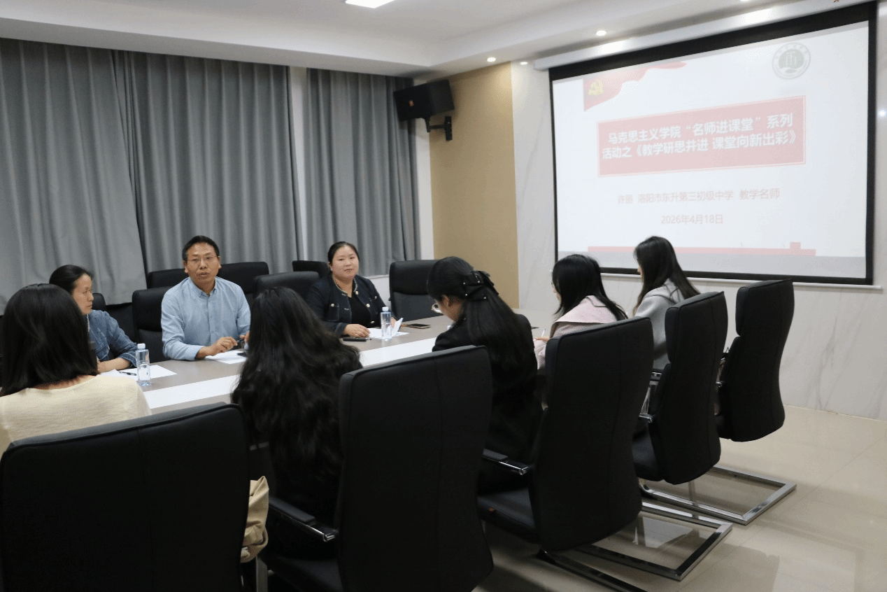 4月18日下午,马克思主义学院“名师进课堂”活动在A3-407会议室顺利开展。本次活动特邀洛阳市东升第三初级中学教学名师许丽莅临讲学,学院副院长田江太、部分思政课教师及学生代表共同参与。