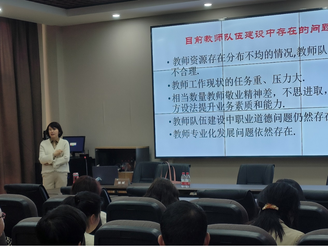 活动伊始,杨丽老师提出教师是教育的第一资源,是建立高质量教育体系、实施高质量教育的根本力量。其次,杨老师指出目前教师队伍建设中仍然存在的诸多问题,如教师资源分布不均、教师队伍结构不合理、职业道德观念不强等等。因此,杨丽老师总结出要采取有效的政策性措施,使各位教师强化职业认同感、更新教育理念、提高教学技能、保持教学的积极性与主动性。