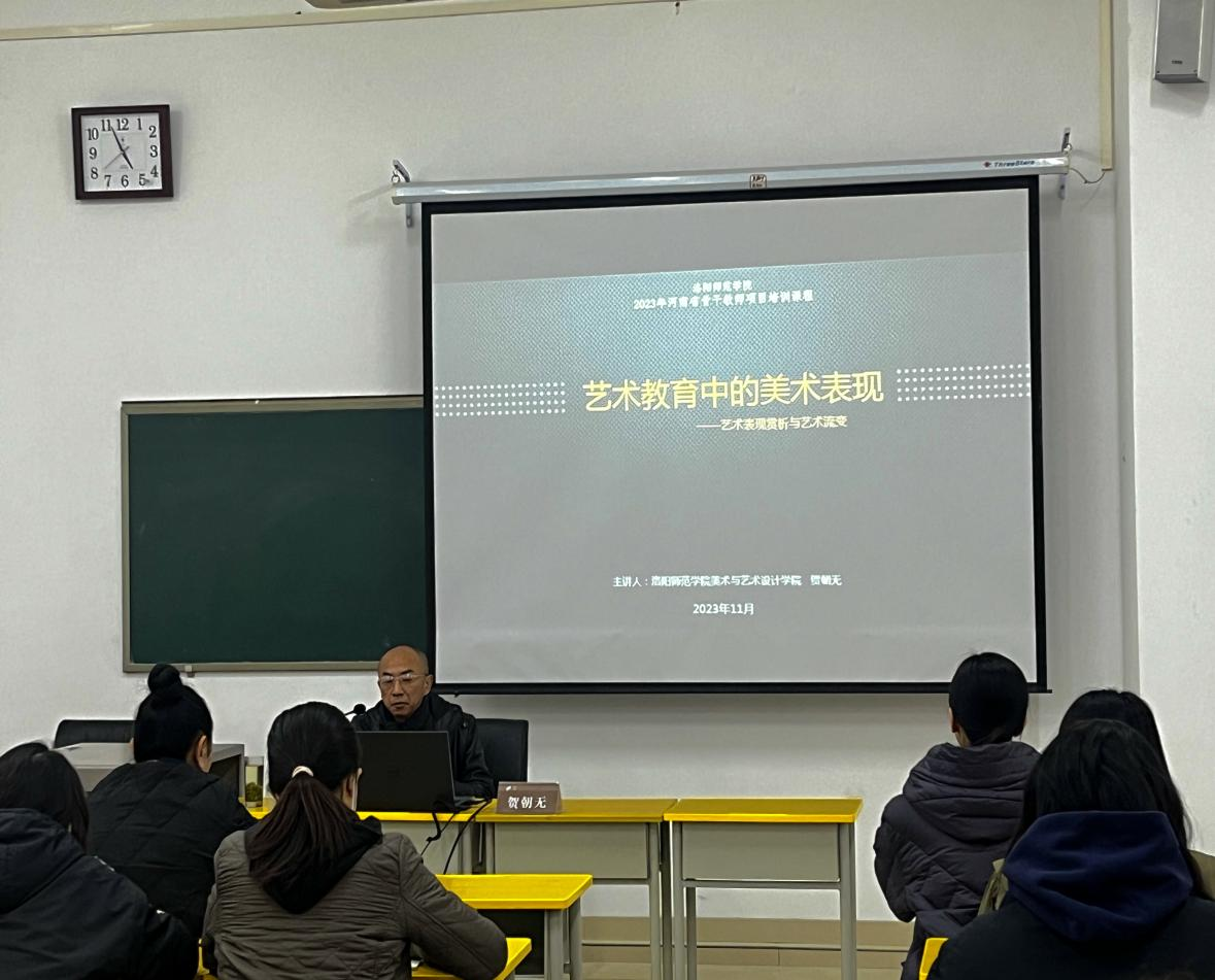 11月11日上午,我院于国培理论教室B402开展主题为“艺术教育中的美术表现”的专题讲座。本次讲座由学院副院长贺朝无主讲,全体学员参加。