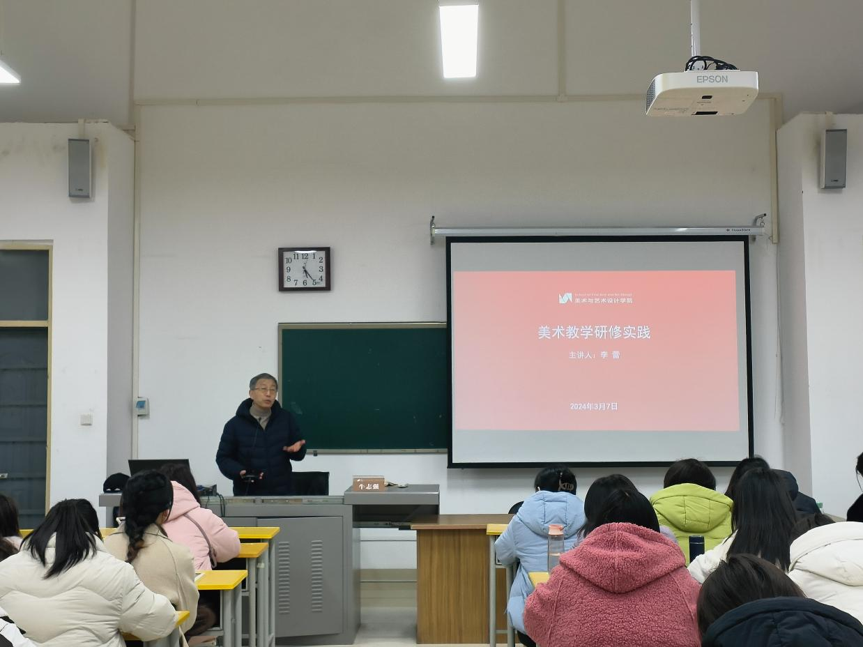 3月6日下午,我院于国培理论教室B402开展“美术教学研修实践”专题讲座,本次讲座由河南大学附属中学中小学高级教师牛志强主讲,全体学员参加。