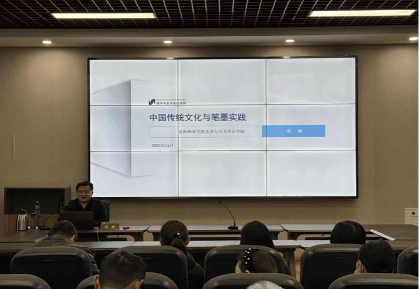 2025 年 11 月 20 日下午,洛阳师范学院美术与艺术设计学院 “义务教育师资薄弱环节改善暨中小学教师素质提升工程培训” 进入第 10 天。学院苟彬教授受邀在国培实践教室B404,以 “中国传统文化与笔墨实践” 为主题,带来一场兼具文化深度与实操价值的专题授课。